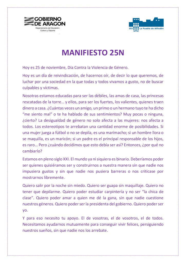 Como cada 25N, las alumnas y alumnos del IES La Puebla de Alfindén toman el protagonismo para reivindicar un mundo sin violencia machista. Así lo reclama nuestro manifiesto, redactado por Lucía Puigdevall, de 3.º B.