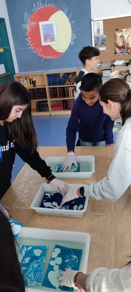 El alumnado de 4.º (de Expresión Artística) y de 1.º de ESO tuvieron la suerte de realizar un taller de cianotipias en nuestro centro, aprendieron esta técnica fotográfica con la que se obtiene una bella y característica tonalidad azul, por medio de la acción fotoquímica de la luz ultravioleta sobre superficies previamente sensibilizadas. Exploraron al máximo las posibilidades gráficas y creativas que esta técnica nos ofrece obteniendo unos resultados increíbles. ¡Enhorabuena artistas!